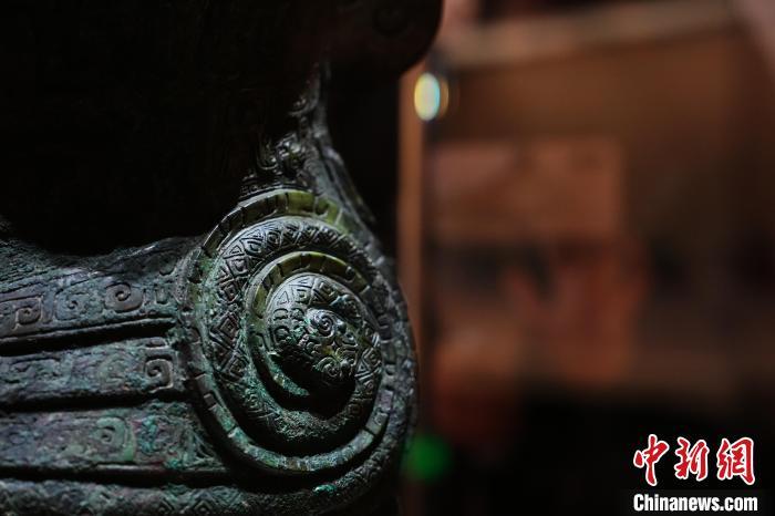 1月22日,北京,“四海一堂春——乙巳蛇年新春文化展”在中国国家博物馆展出。图为展出的妇好鸮尊(局部)。此鸮尊双翅部位各装饰有一条盘曲状的蛇。 中新社记者 赵文宇 摄