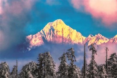 冬日里,四川贡嘎山“日照金山”景观与森林雾凇交相辉映。