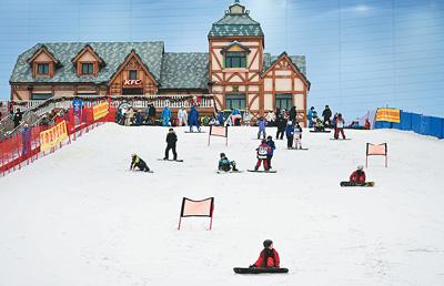 游客在广州热雪奇迹室内滑雪场游玩。