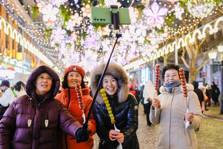 2025年1月30日,游客在哈尔滨中央大街上手持糖葫芦自拍。新华社记者 王建威 摄